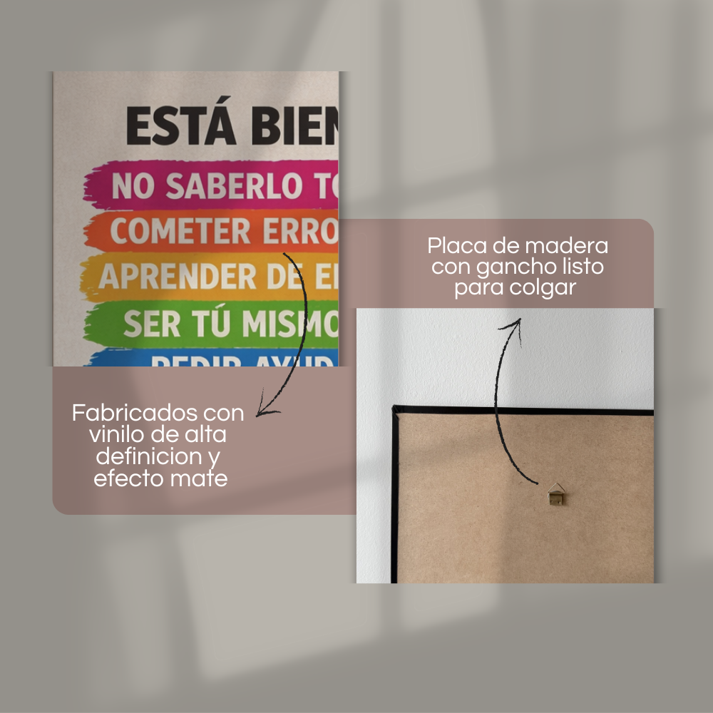 Nuestros cuadros están fabricados con base de madera resistente y cuentan con vinilo de alta calidad con acabado mate, lo que les da una apariencia elegante y sin reflejos.