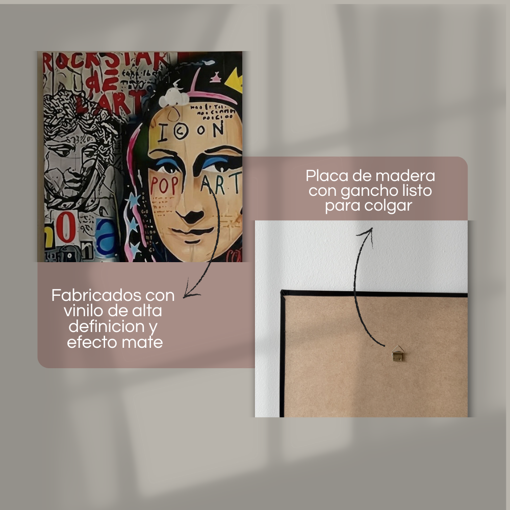 Nuestros cuadros están fabricados con base de madera resistente y cuentan con vinilo de alta calidad con acabado mate, lo que les da una apariencia elegante y sin reflejos.