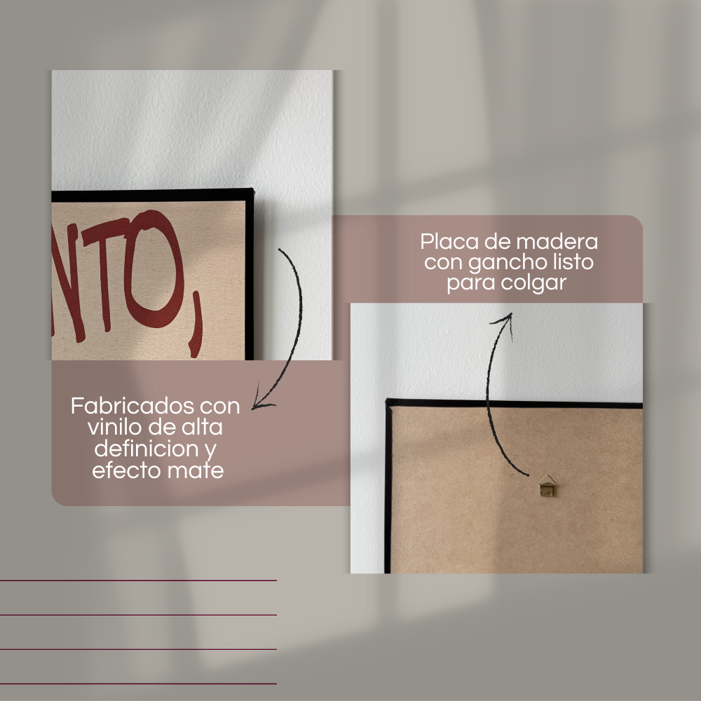 Nuestros cuadros están fabricados con base de madera resistente y cuentan con vinilo de alta calidad con acabado mate, lo que les da una apariencia elegante y sin reflejos.