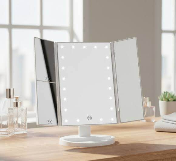 Iluminá tu rutina de belleza con este espejo de maquillaje tríptico con luces LED, diseñado para lograr un maquillaje perfecto en cualquier momento. Sus paneles laterales con aumento 2X y 3X permiten ver cada detalle con claridad, ideal para delineado, cejas, skincare y maquillaje profesional.